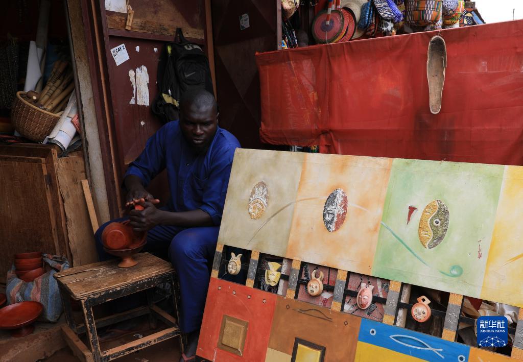 9月16日,在喀麥隆首都雅溫得手工藝品市場,一名手工藝人在製作手工藝品。