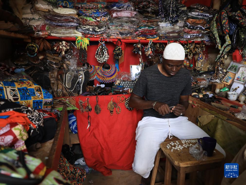 9月16日,在喀麥隆首都雅溫得手工藝品市場,一名手工藝人製作手工藝品。