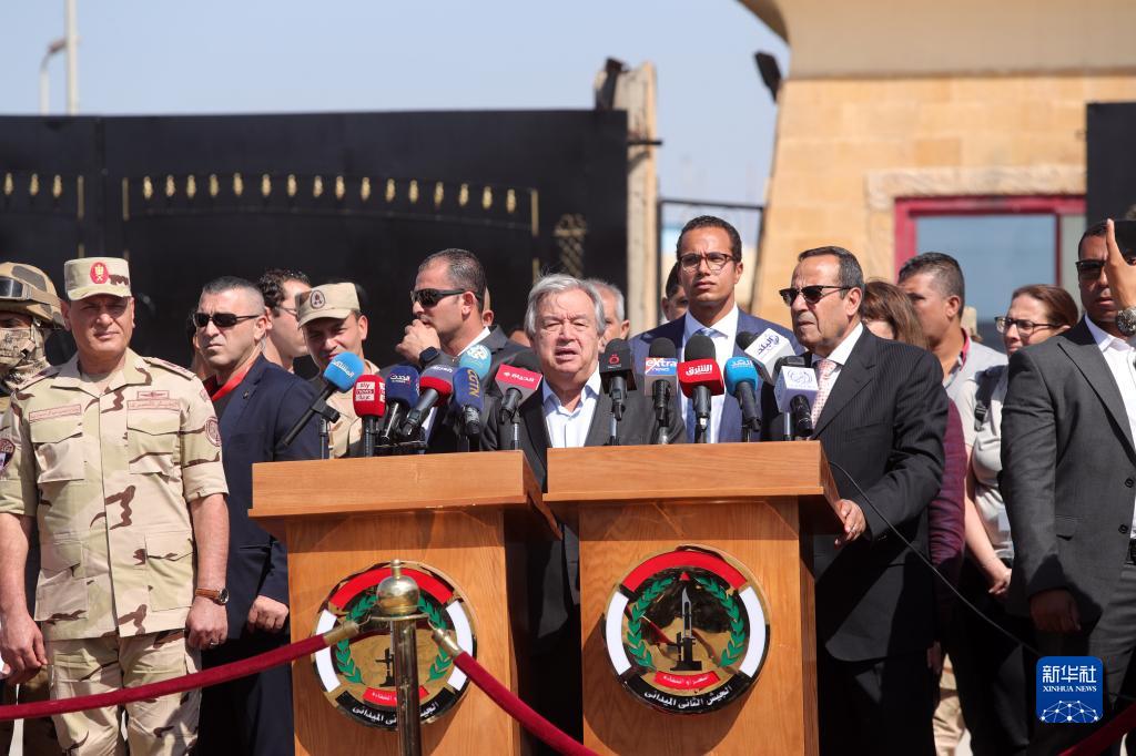 10月20日,在拉法口岸埃及一側,聯合國秘書長古特雷斯(中)發表講話。新華社發(艾哈邁德·戈馬攝)