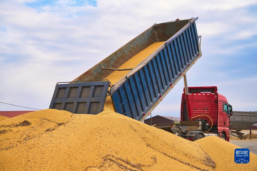 10月22日,在俄羅斯遠東城市烏蘇裏斯克,一輛卡車正在卸載收穫的大豆。