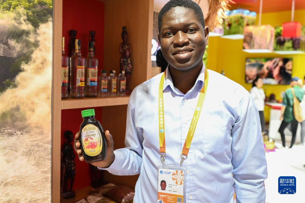 11月8日,在第六屆進博會上,展商展示烏干達蜂蜜産品。