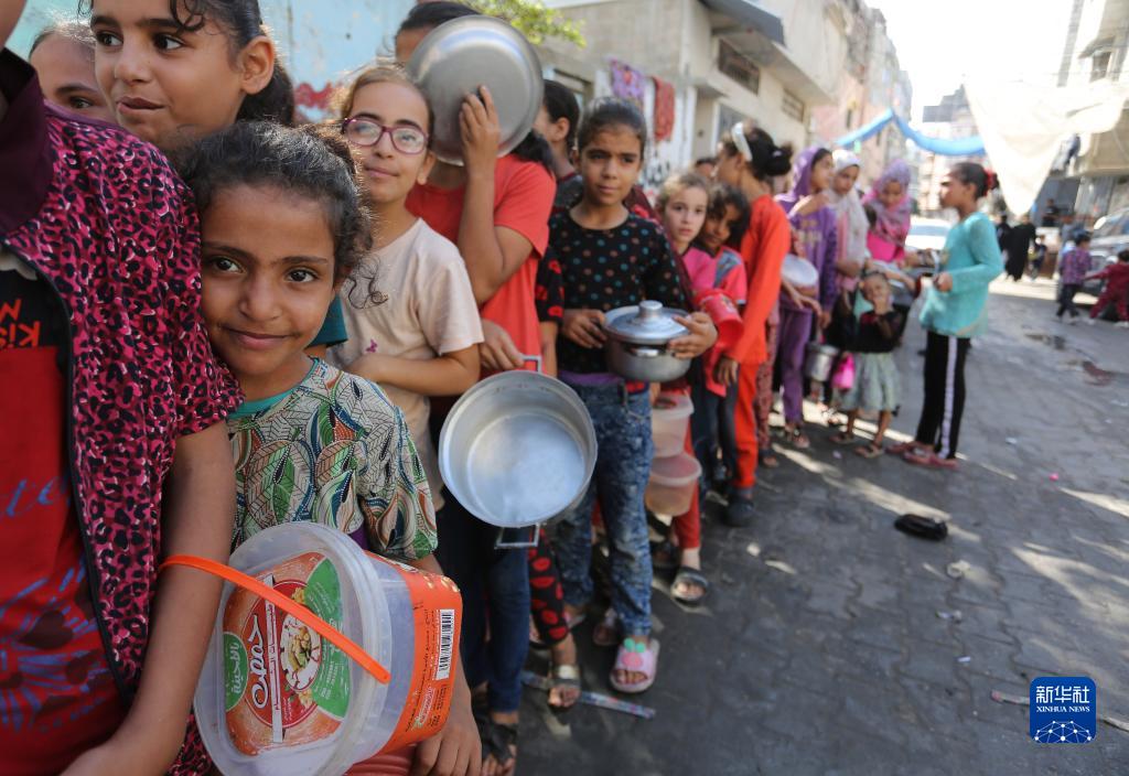 11月9日,在加沙地帶南部城市拉法,人們在一個臨時分發點排隊領取食物。