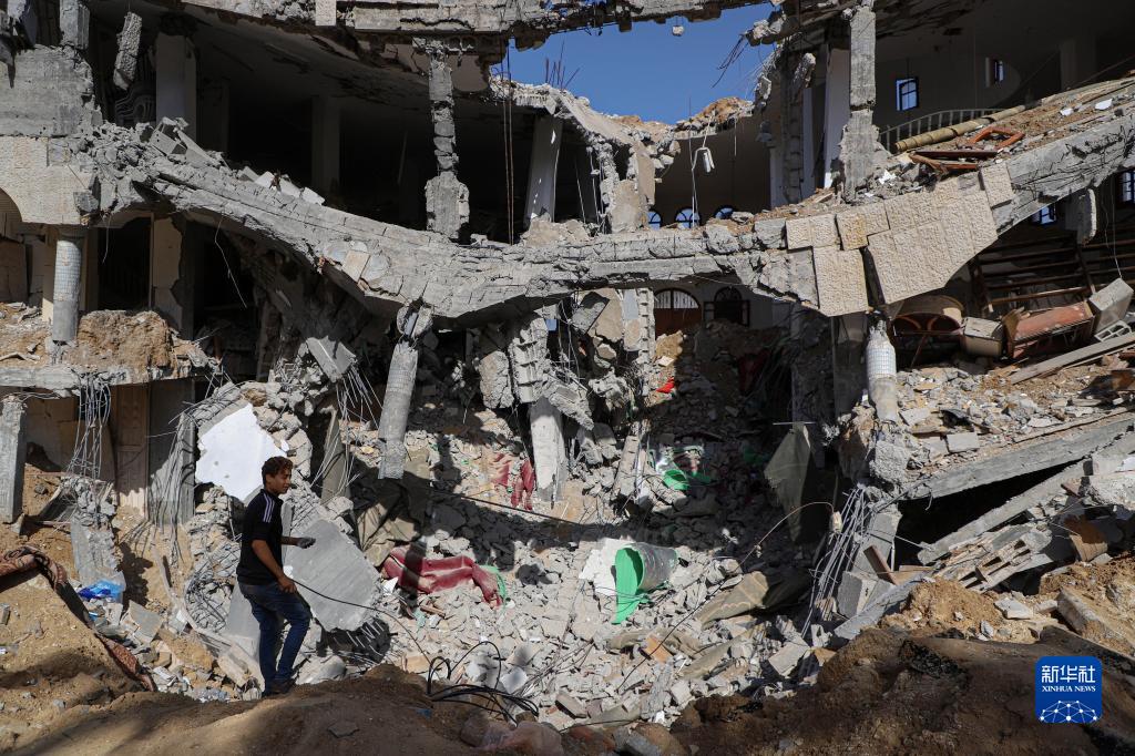 這是11月9日在加沙地帶南部城市汗尤尼斯拍攝的被損毀的建築物。