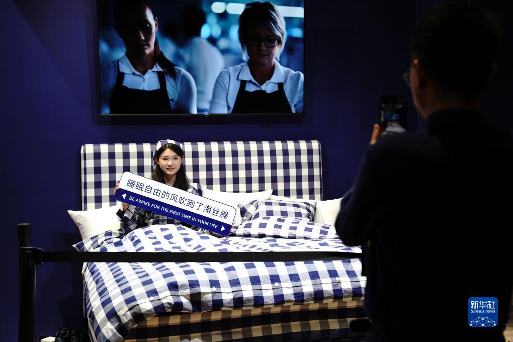 11月8日,在第六屆進博會消費品展區,模特展示瑞典海絲騰床上用品。