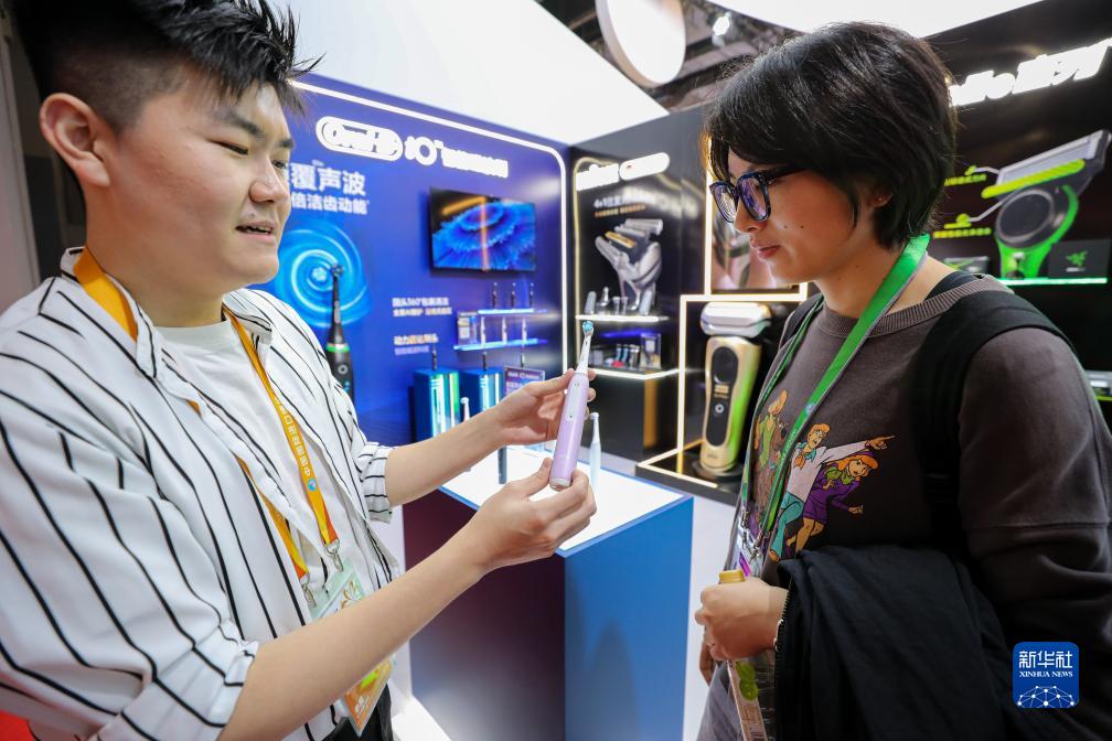 11月8日,寶潔公司工作人員在第六屆進博會消費品展區向觀眾介紹歐樂B電動牙刷。