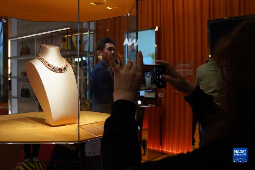 11月9日,在第六屆進博會消費品展區,參觀者在寶格麗展&拍攝展出的珠寶。