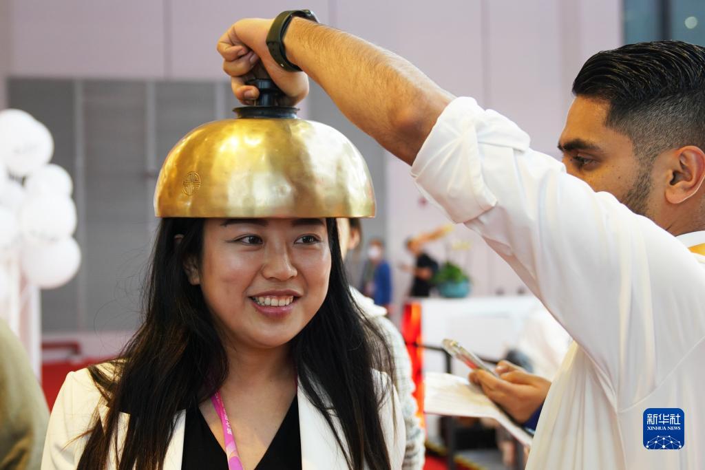 11月9日,在第六屆進博會消費品展區,參觀者在感受敲擊頌缽的聲音。