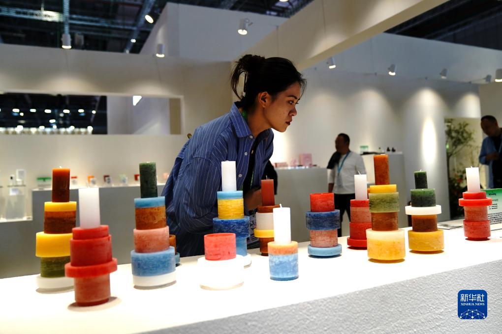 11月6日,在第六屆進博會消費品展區,觀眾觀看比利時蠟燭。