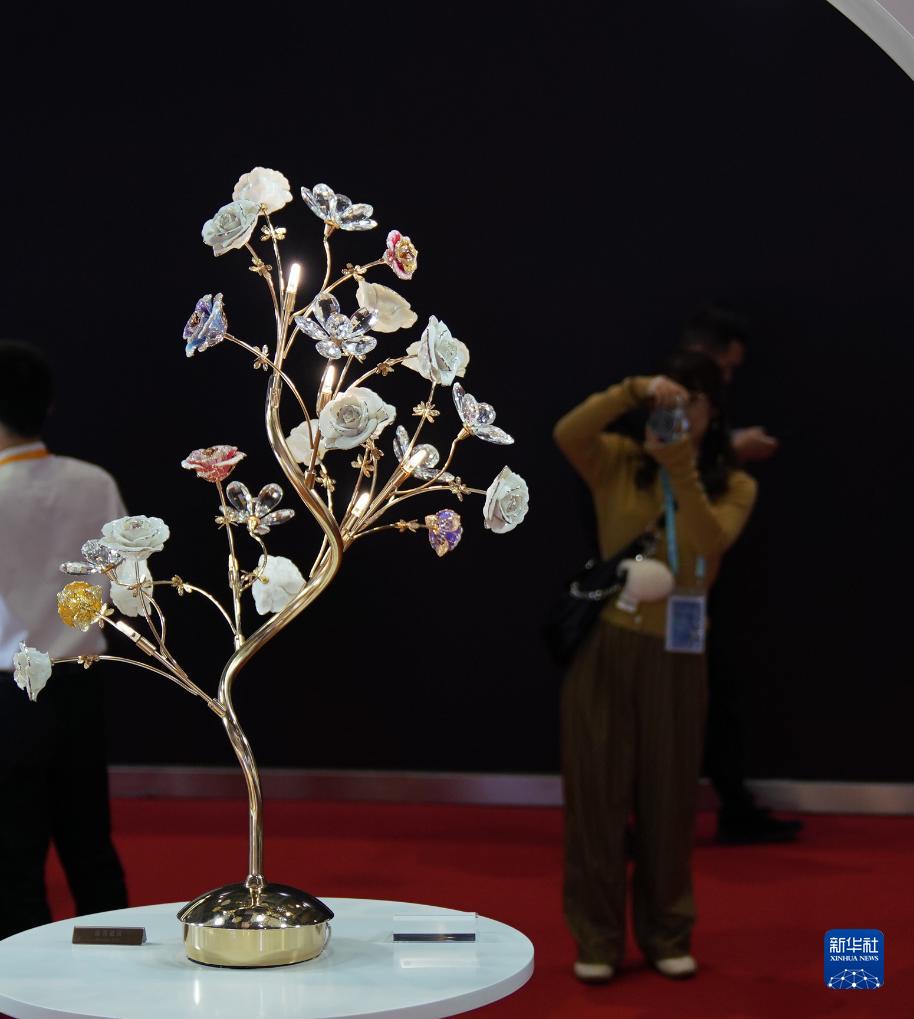 11月9日,在第六屆進博會消費品展區,參觀者在EJI(雅寶珠寶國際有限公司)展&拍攝展出的琺瑯鑽石花燈。