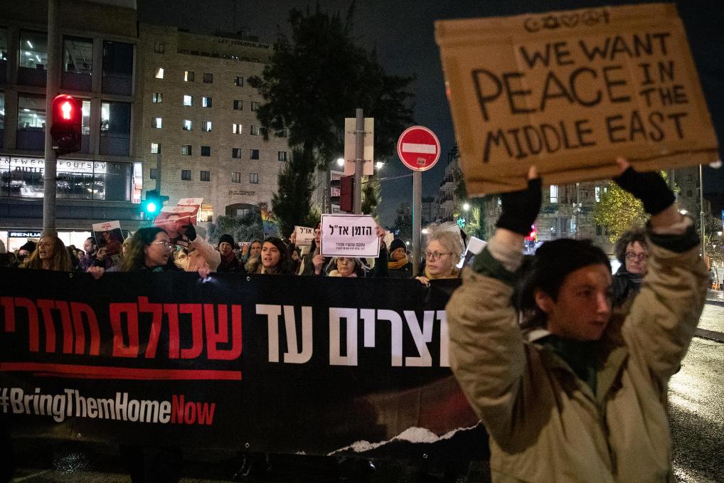 1月24日,人們在耶路撒冷街頭參加游行。當日,部分民眾在耶路撒冷舉行游行,呼籲以色列政府在加沙停火止戰,並盡快採取措施讓被扣押在加沙地帶人員獲得釋放。新華社記者陳君清攝