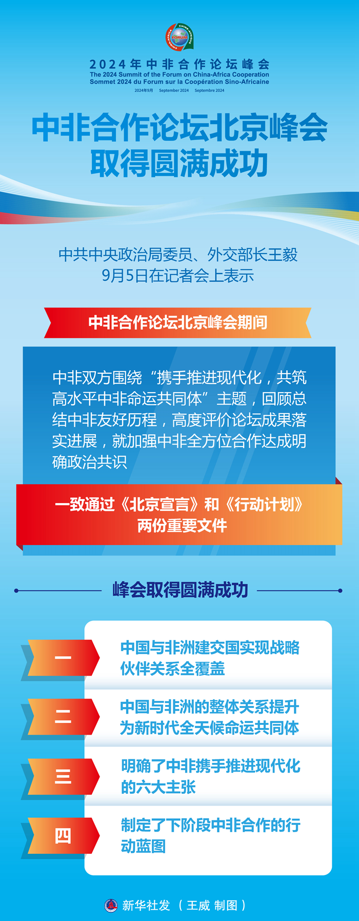 四是制定了下階段中非合作行動藍圖。雙方通過了未來3年加強中非合作的《北京宣言》和《行動計劃》。習近平主席宣布了中方未來3年同非方開展攜手推進現代化十大夥伴行動。一是文明互鑒夥伴行動,打造治國理政經驗交流平台,設立中非發展知識網絡,邀請1000名非洲政黨人士來華交流。二是貿易繁榮夥伴行動。宣布單方面擴大市場開放,給予非洲最不發達國家100%稅目産品零關稅待遇,推動中國大市場成為非洲大機遇。三是産業鏈合作夥伴行動,建設中非經貿深度合作先行區,啟動“非洲中小企業賦能計劃”,共建中非數字技術合作中心。四是互聯互通夥伴行動,打造陸海聯動、協同發展的中非互聯互通網絡,助力非洲跨區域發展。五是發展合作夥伴行動,實施1000個“小而美”民生項目,促進發展成果更好惠及非洲人民。六是衞生健康夥伴行動,共建聯合醫學中心,向非洲派遣2000名醫療隊員,支持非洲疾控中心建設。七是興農惠民夥伴行動,向非洲提供緊急糧食援助,建設農業標準化示範區,為非洲創造不少於100萬個就業崗位。八是人文交流夥伴行動,推進“未來非洲職業教育”計劃,提供6萬個研修名額,將2026年確定為“中非人文交流年”。九是綠色發展夥伴行動,在非洲實施30個清潔能源項目,共建30個聯合實驗室,開展衛星遙感、月球和深空探測合作。十是安全共築夥伴行動,打造落實全球安全倡議合作示範區,為非洲培訓軍事和警務人才。