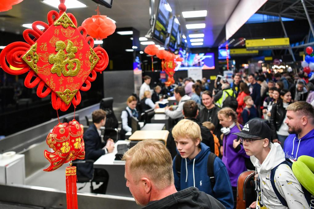 9月28日,在俄羅斯韃靼斯坦共和國喀山國際機場,搭乘喀山至上海直飛航班的乘客辦理值機。新華社記者 曹陽 攝