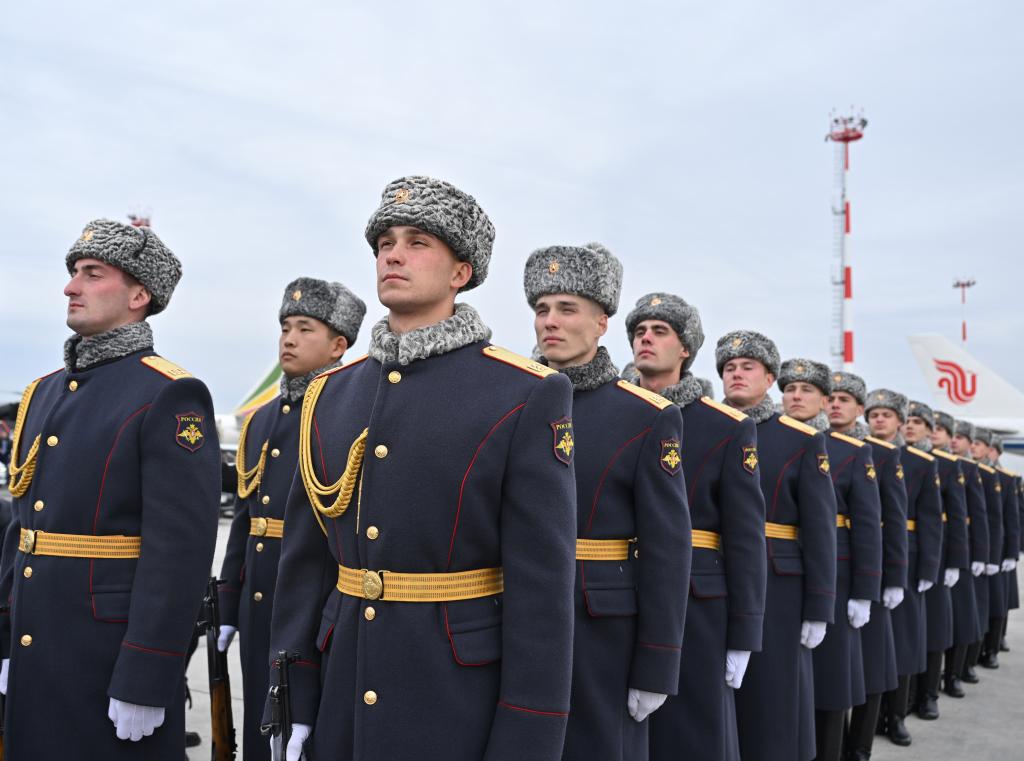 禮兵在紅毯兩側列隊致敬,身着民族服裝的俄羅斯女青年用傳統禮節&&歡迎。