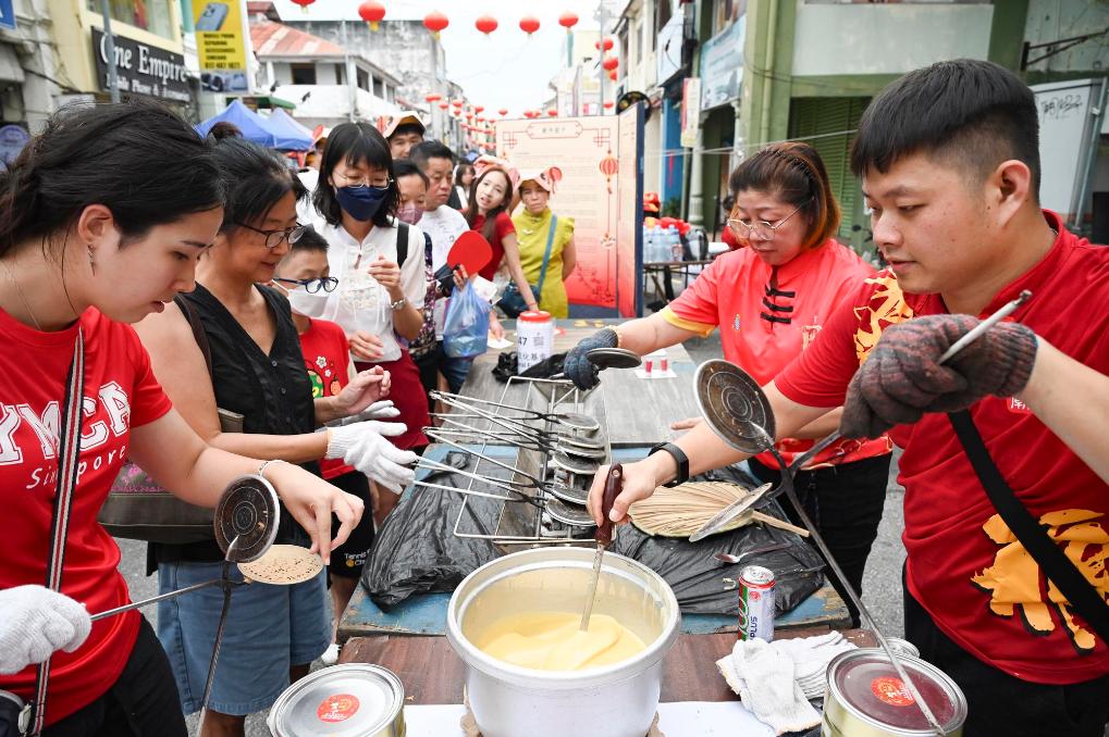 2月1日,人們在馬來西亞檳城廟會上體驗年餅製作。新華社發(李奕慧攝)