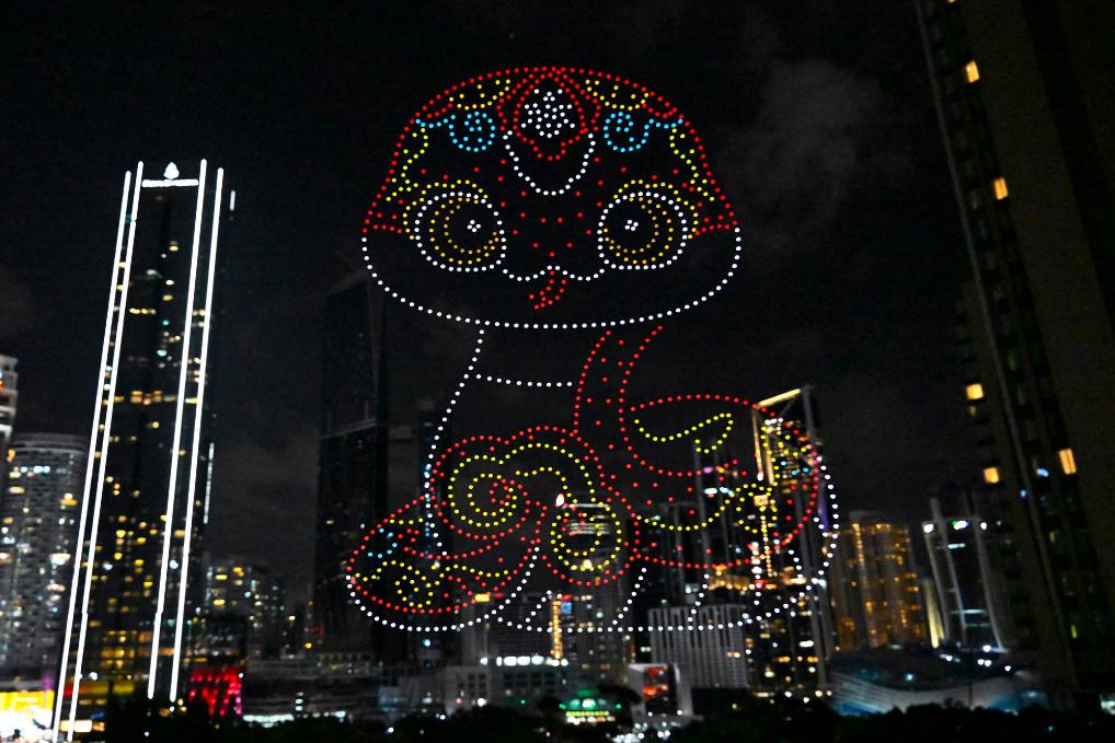 1月25日,在馬來西亞吉隆坡舉行的2025年“歡樂春節”全球啟動儀式前,無人機展示蛇年主題圖案。新華社記者程一恒攝