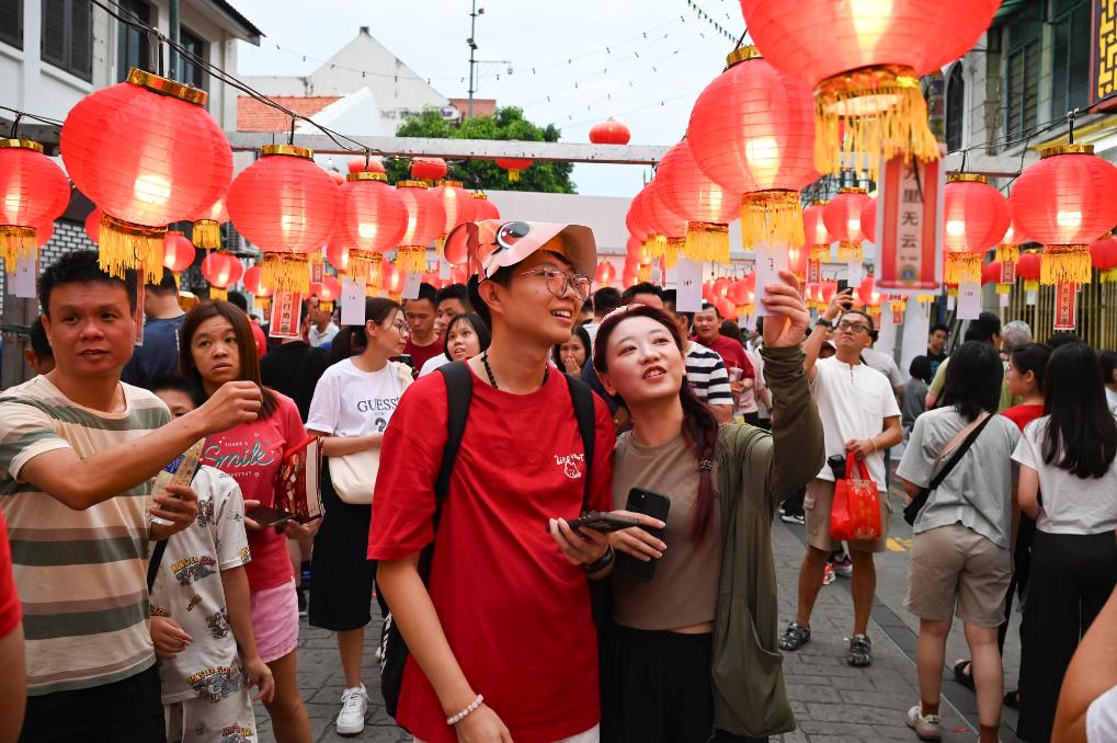 2月1日,人們在馬來西亞檳城廟會拍照打卡。新華社發(李奕慧攝)