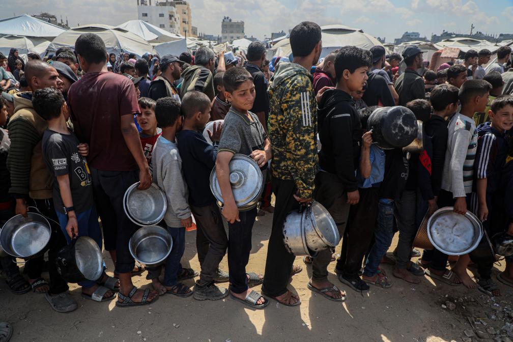 5月2日,人們在加沙城等待領取救助食物。新華社發(裏澤克·阿卜杜勒賈瓦德攝)