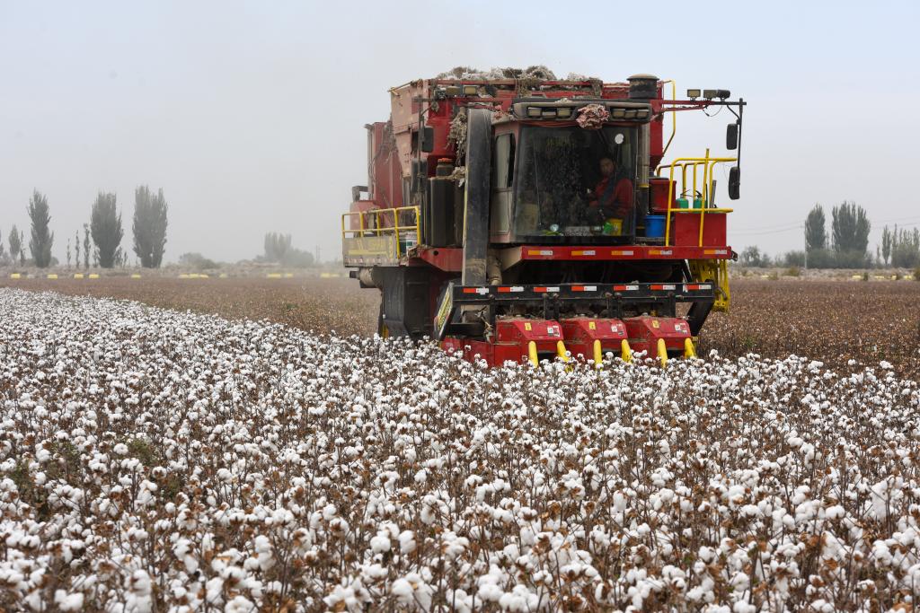 2024年10月24日,在新疆阿瓦提縣,一台大型採棉機在棉田裏作業。新華社記者 高晗 攝