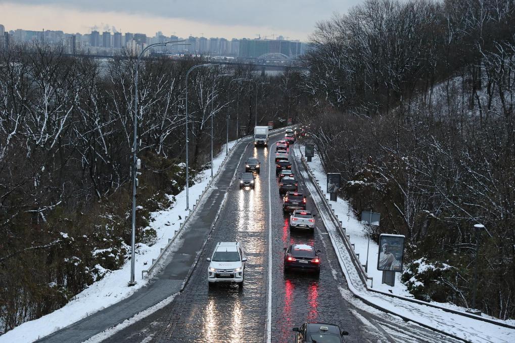 這是2024年11月21日拍攝的白雪映襯下的烏克蘭首都基輔右岸沿河公路。新華社記者李東旭攝