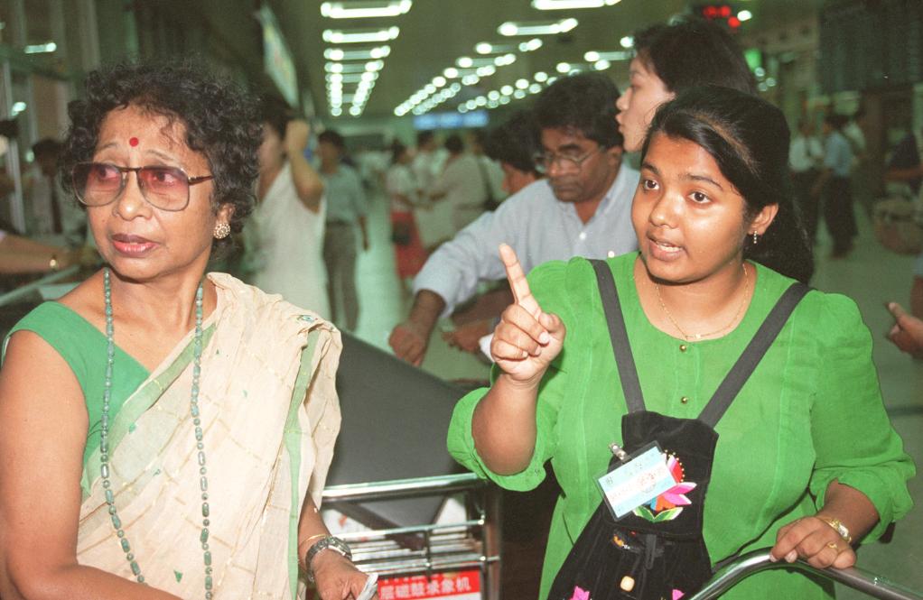 1995年8月28日,北京醫科大學孟加拉國籍留學生羅可茜(右)在首都機場幫助從印度來北京參加95婦女論壇的一位女士辦理手續。
