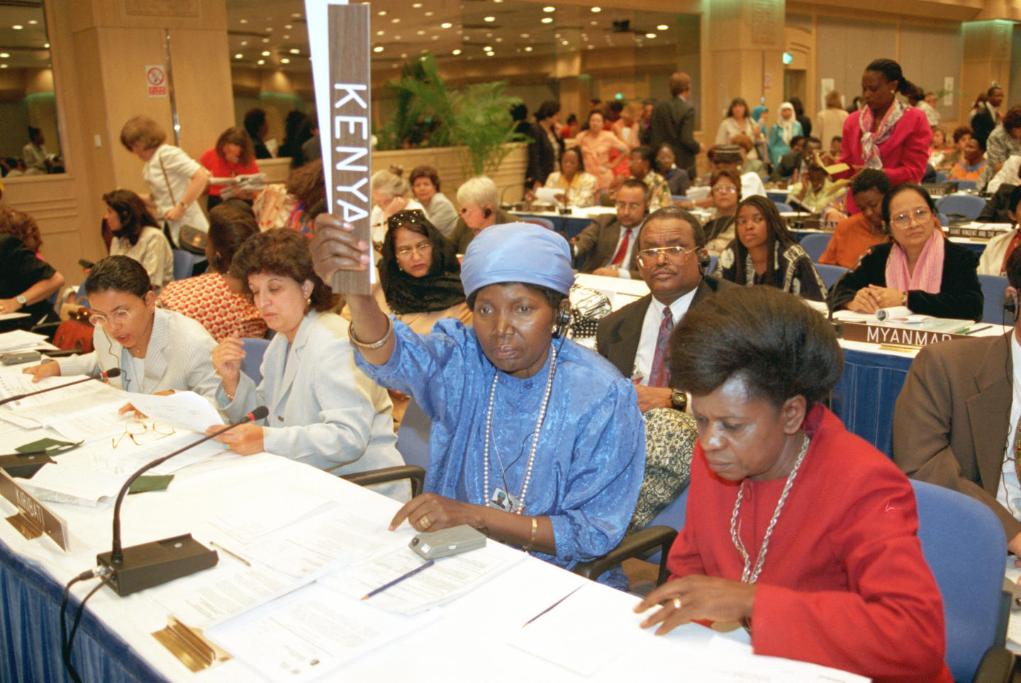 1995年9月5日以來,世婦會分組討論全面展開。這是肯尼亞代表格雷斯·奧哥特夫人在參加審議《行動綱領》草案的討論時,舉牌要求發言。