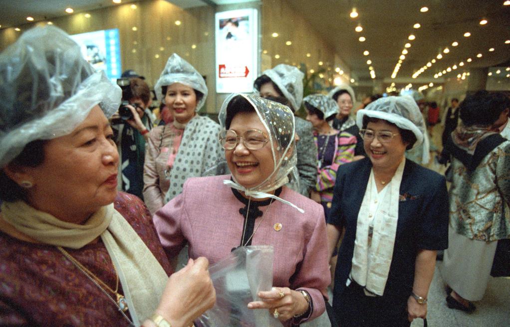 1995年9月6日,北京秋雨濛濛。在北京國際會議中心,幾位參加聯合國第四次世婦會的泰國代表用塑料袋套在頭上當雨具。