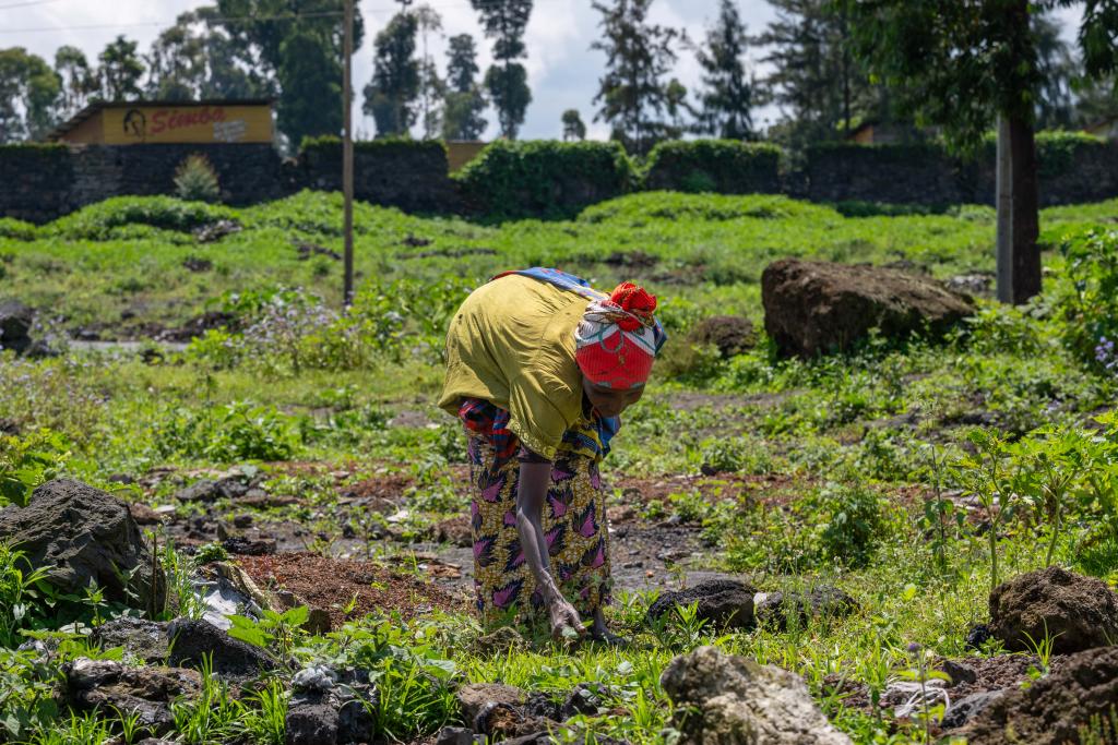 5月6日,在剛果(金)東部北基伍省戈馬市郊,一名流離失所者在路邊的草叢裏尋找馬齒莧充饑。新華社記者鄭揚子攝