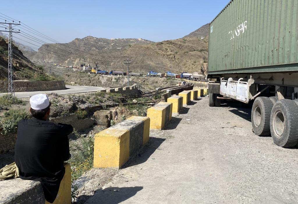 10月13日,在巴基斯坦與阿富汗的邊境口岸多爾哈姆,卡車因邊境地區衝突而滯留。新華社發
