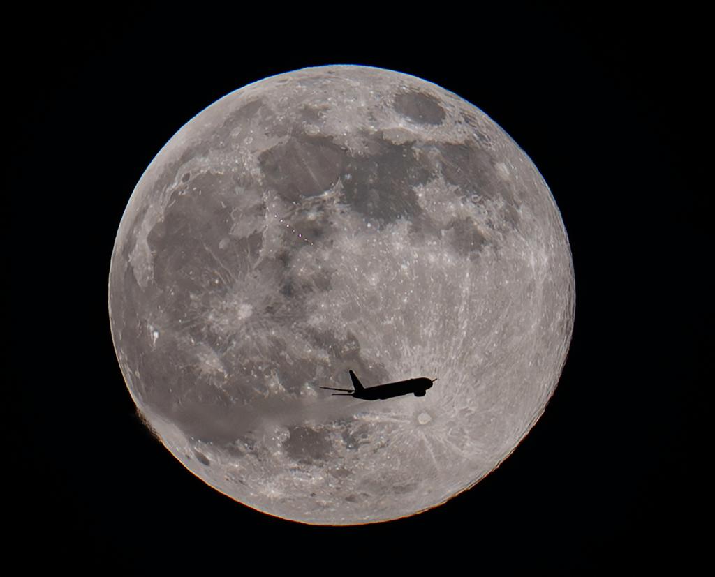 這是11月5日在科威特首都科威特城拍攝的“超級月亮”和一架飛機。