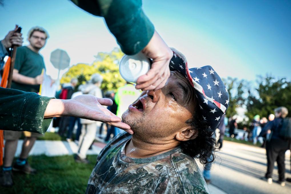 9月26日,在位於美國芝加哥西郊布羅德維尤市的移民與海關執法局辦事機構外,執法人員發射的催淚彈傷及一名抗議者,同伴在為他進行緊急處置。新華社發(文森特·約翰遜攝)