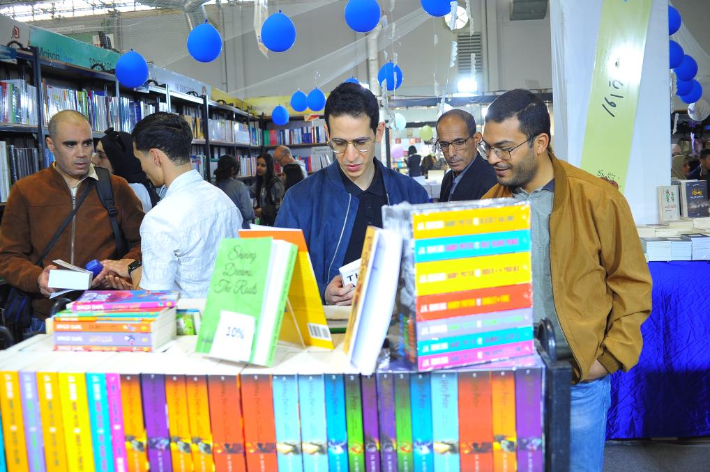 4月26日,在突尼斯首都突尼斯市,人們在國際書展上選購書籍。新華社發(阿代爾攝)