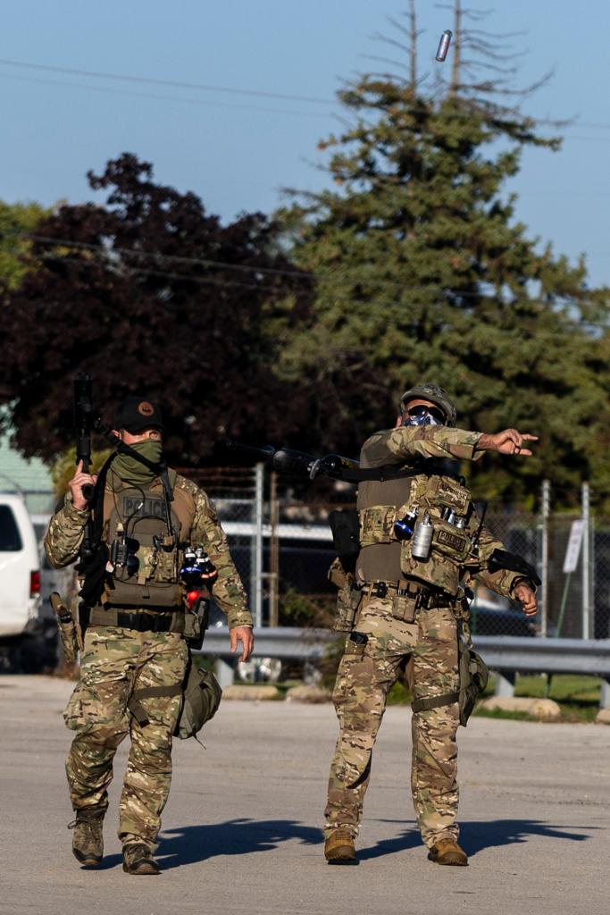9月26日,在位於美國芝加哥西郊布羅德維尤市的移民與海關執法局辦事機構,執法人員向抗議者投擲催淚彈。新華社發(文森特·約翰遜攝)