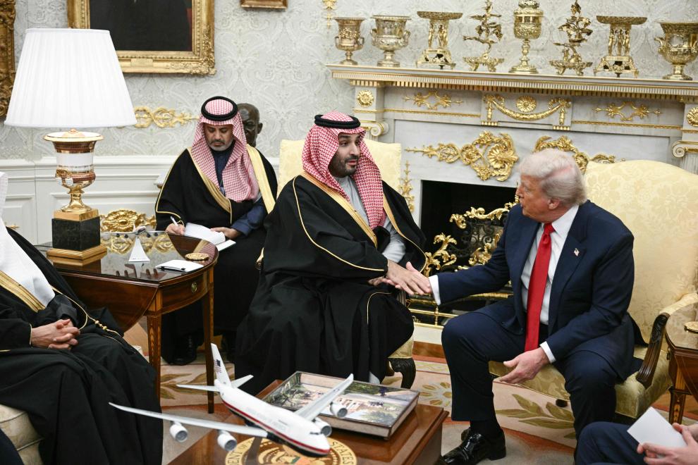 11月18日,美國總統特朗普(右)在華盛頓白宮與到訪的沙特阿拉伯王儲兼首相穆罕默德(中)握手。新華社/法新