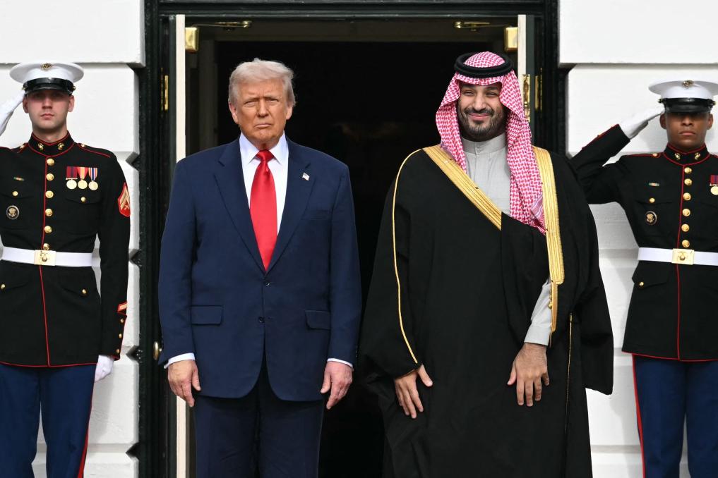 11月18日,美國總統特朗普(前左)在華盛頓白宮歡迎到訪的沙特阿拉伯王儲兼首相穆罕默德(前右)。新華社/法新