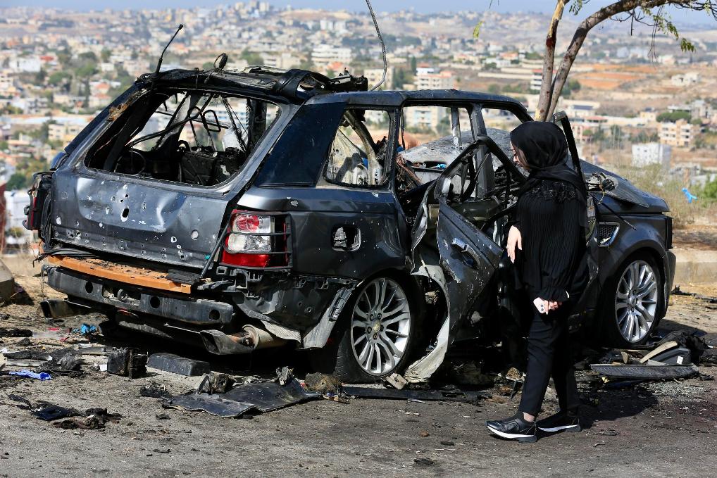 11月2日,在黎巴嫩南部一村莊,一名女子看著遭襲汽車殘骸。據黎巴嫩公共衞生部消息,以色列11月1日晚對黎南部發動空襲,造成4人死亡、3人受傷。新華社發(阿里·哈希紹攝)