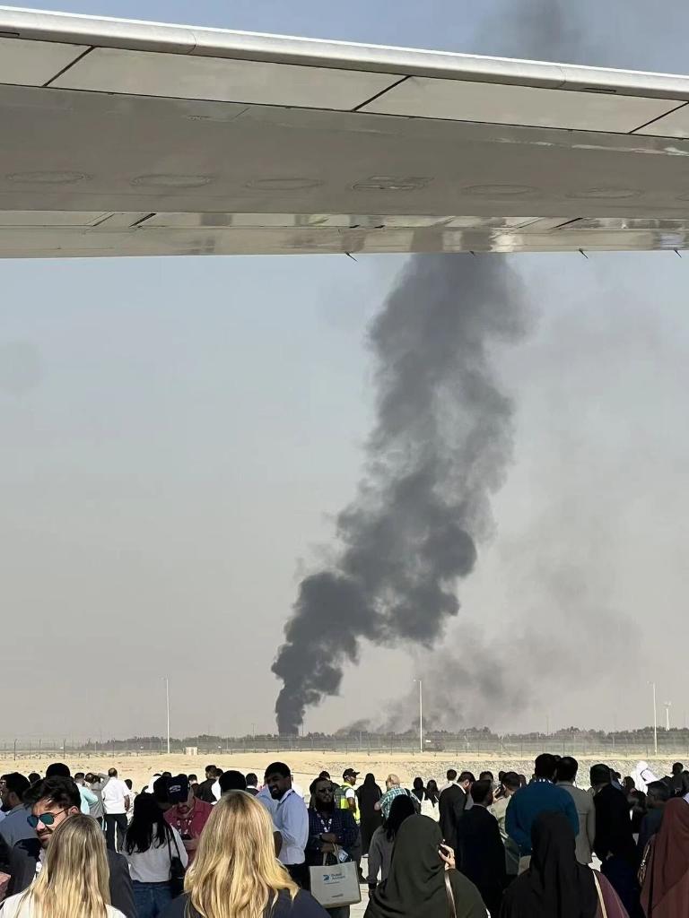 11月21日,在阿聯酋迪拜,飛機墜毀現場冒出滾滾濃煙。新華社發
