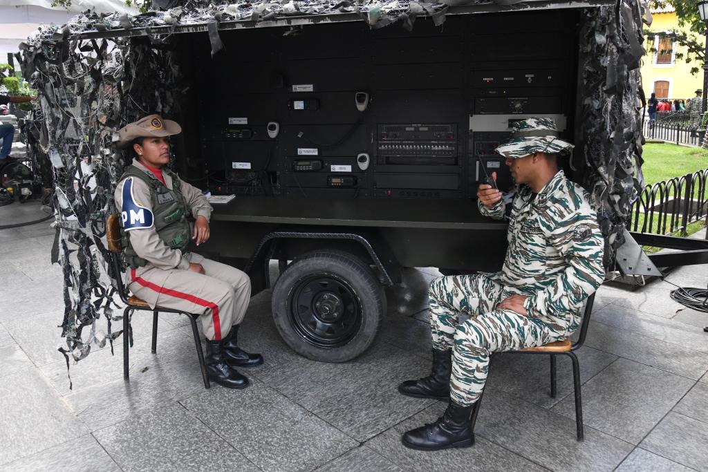 10月4日,在委內瑞拉首都加拉加斯的玻利瓦爾廣場,玻利瓦爾民兵組織成員操作通信設備。新華社發(馬科斯·薩爾加多攝)