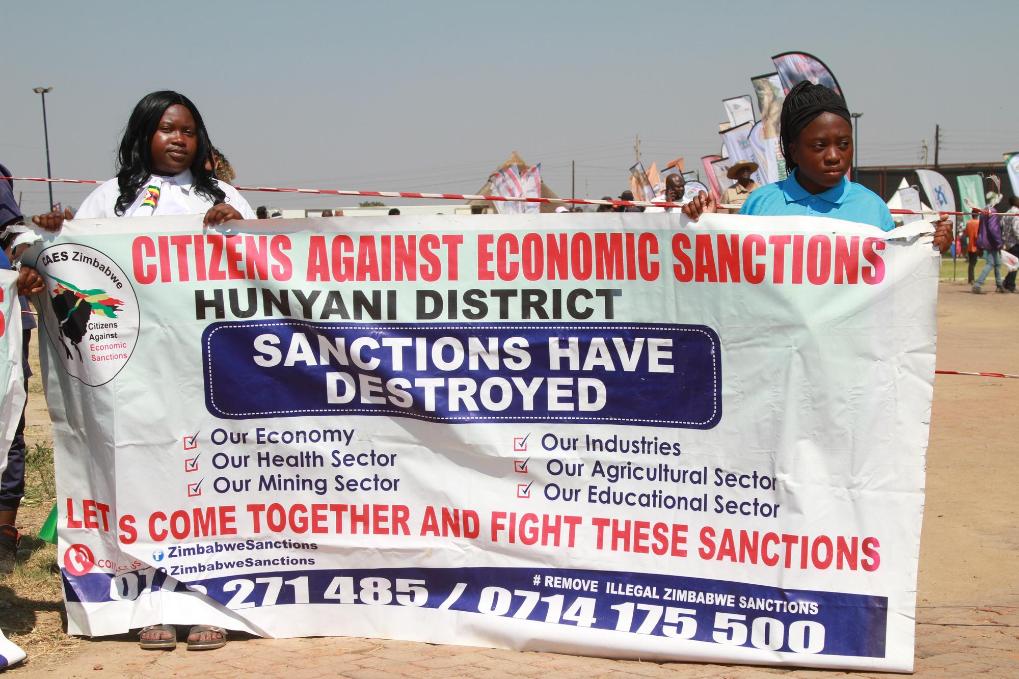 10月25日,在津巴布韋首都哈拉雷舉行的“南部非洲發展共同體(南共體)反制裁日”活動上,津巴布韋青年舉着反對制裁的海報。新華社發(塔法拉攝)