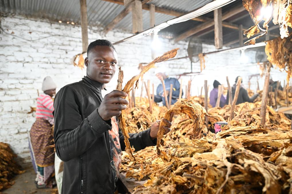 7月10日,在津巴布韋東馬紹納蘭省一座農場內,當地工人展示剛剛收穫的煙葉。新華社記者許正攝
