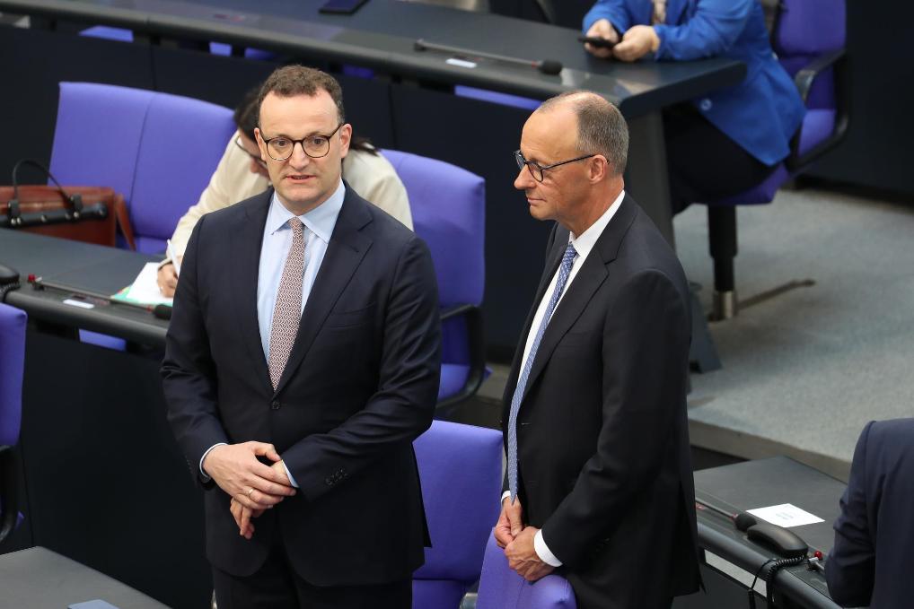 5月6日,在德國首都柏林的國會大廈,默茨(右)在第二輪投票議程中。新華社記者杜哲宇攝