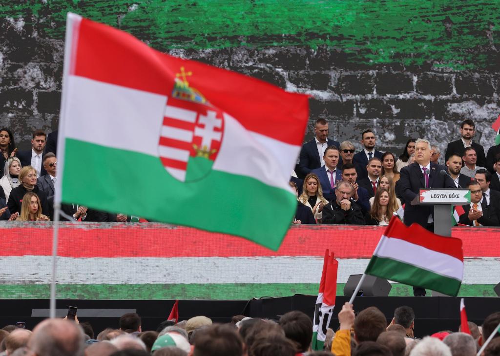 2025年10月23日,匈牙利總理歐爾班(前右)在首都布達佩斯舉行的一場集會上講話。新華社發(弗爾季·奧蒂洛攝)