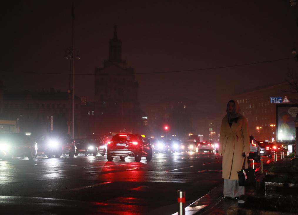 2025年11月20日,因俄羅斯對烏克蘭發動大規模空襲,烏首都基輔主要街道的照明設施出現大面積停電,夜色中市民在路邊等車。新華社記者李東旭攝