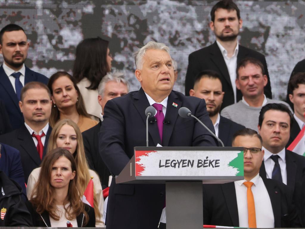 10月23日,匈牙利總理歐爾班在首都布達佩斯舉行的一場集會上講話。新華社發(弗爾季·奧蒂洛攝)