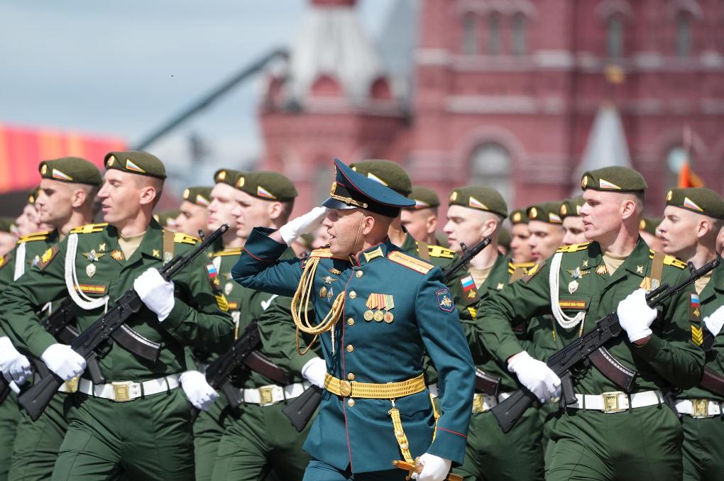 5月9日,在俄羅斯首都莫斯科,軍人參加紀念蘇聯偉大衛國戰爭勝利80周年閱兵式。新華社記者賴向東攝