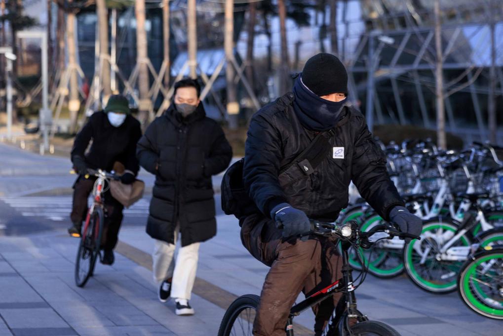 1月9日,在韓國首都首爾,人們在低溫中出行。新華社發(樸晉澤攝)