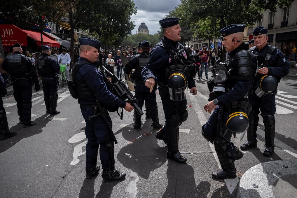 9月10日,警察在法國巴黎夏特萊廣場附近的游行示威現場警戒。新華社發(奧雷利安·莫裏薩爾攝)