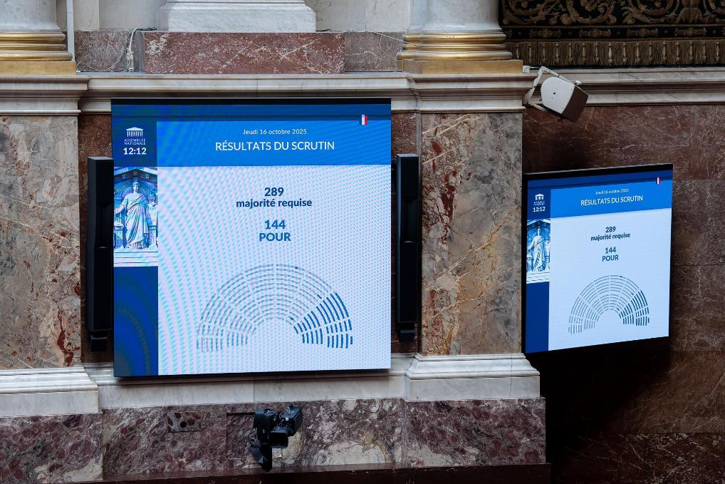 這是10月16日在位於法國巴黎的國民議會拍攝的第二項不信任動議投票結果。法國國民議會16日對兩項針對政府的不信任動議進行了投票,動議最終都未獲通過,政府未被議會推翻。新華社發(奧雷利安·莫裏薩爾攝)