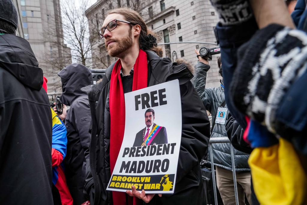 法院外,抗議者聚集,呼喊口號,要求釋放馬杜羅,抗議美國軍事干涉委內瑞拉。一些人舉着“釋放馬杜羅總統”“不要向委內瑞拉開戰”“停止對委內瑞拉的非法戰爭”等標語橫幅。