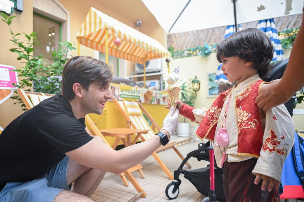 2025年9月30日,來自意大利的亞歷山大在他開的冰淇淋店內與顧客互動。