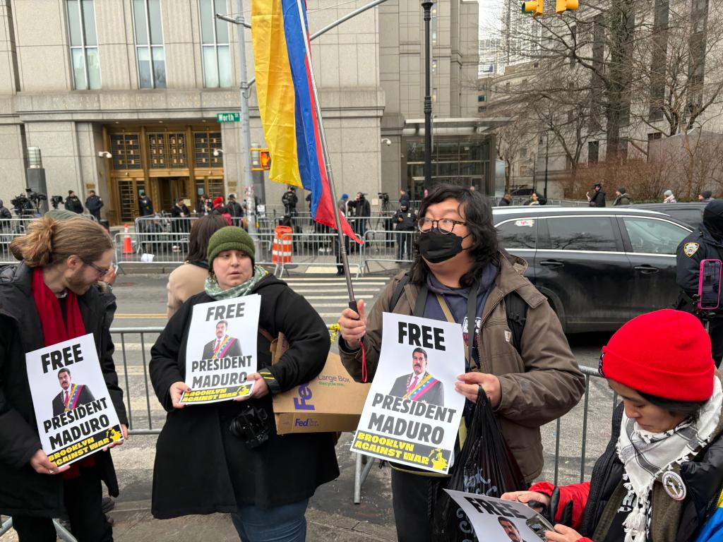 庭內有抗辯,庭外有抗議。美國紐約南區聯邦法院外,抗議者聚集,他們高呼口號,舉着“釋放馬杜羅”“不要向委內瑞拉開戰”等標語橫幅。